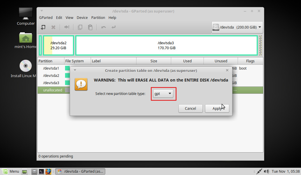 El primer paso será modificar el tipo de particionado del disco de MBR a GPT, que nos ayudará a tener un sistema más estable.