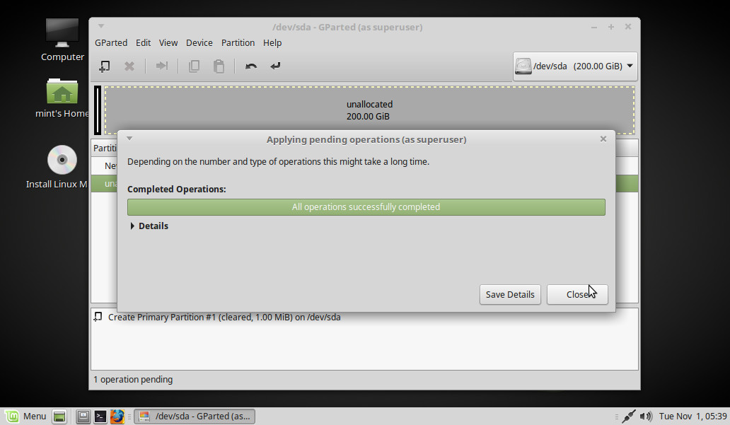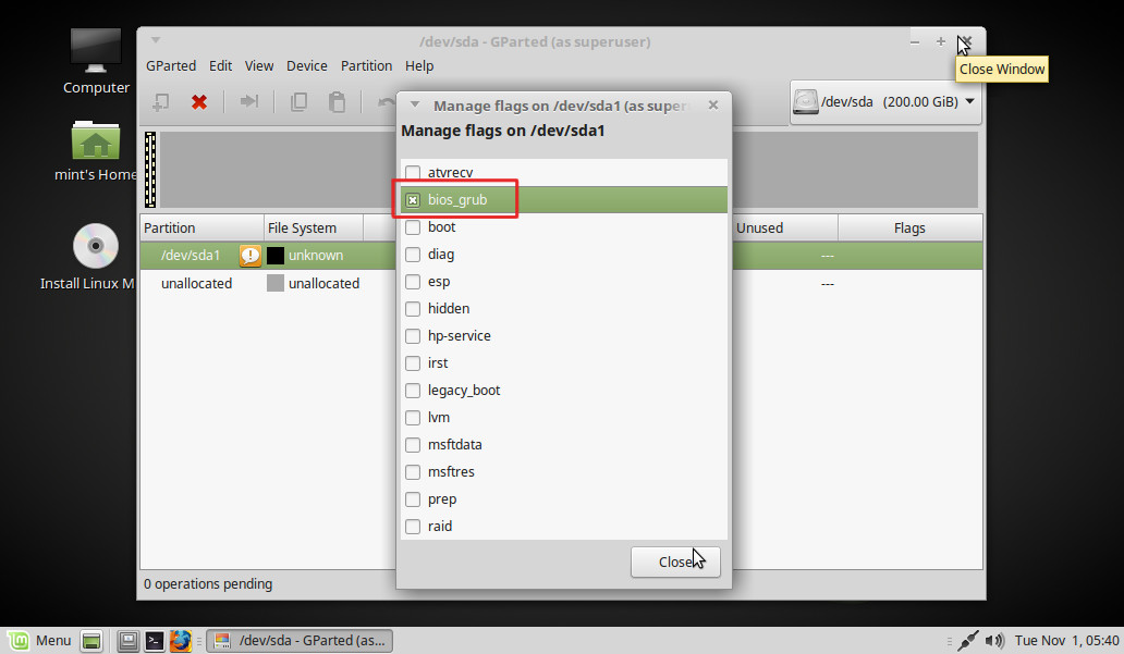 Marcamos bios_grub > Close y cerramos también la ventana de GParted: