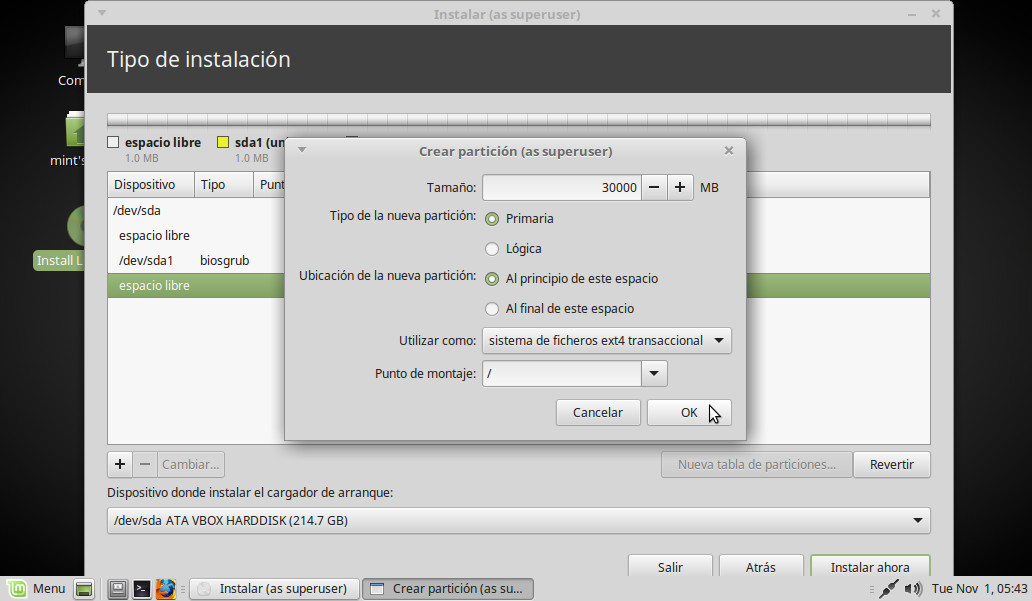 Dejamos las opciones de la siguiente manera: Tamaño: Indicamos 30000 (suficiente para instalar el sistema). Utilizar como: Elegimos en el desplegable la opción que indica ext4. Punto de montaje: Elegimos la primera opción, "/" (equivalente a C: en Windows) y OK: