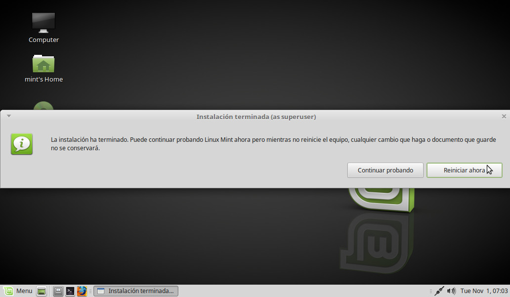 Instalación finalizada. Pinchamos en Reiniciar ahora