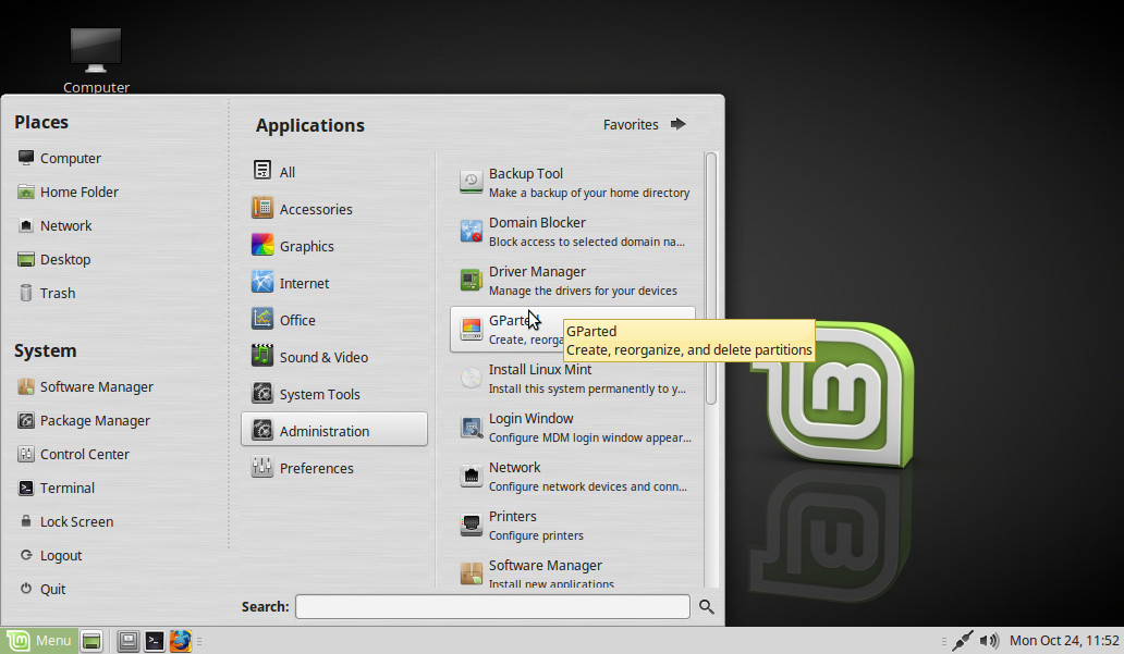 Hacemos Menú > Administración > GParted (modo de vista All aplications):