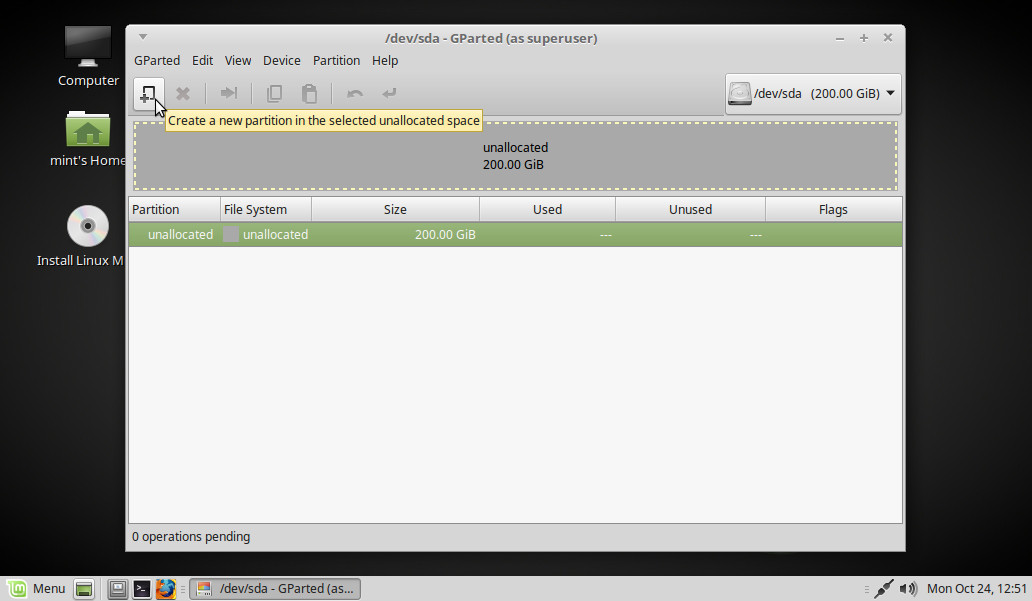 Tenemos el disco vacio. Pinchamos en el icono para crear una nueva partición: