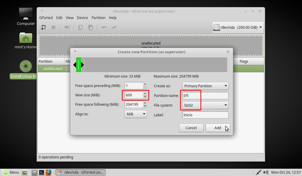 Lo dejamos como en la imagen: New Size (MiB): 600. Partition name: EFI. File system: fat32. Label: El que queramos. Add: