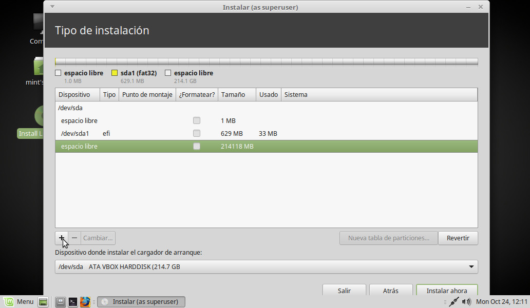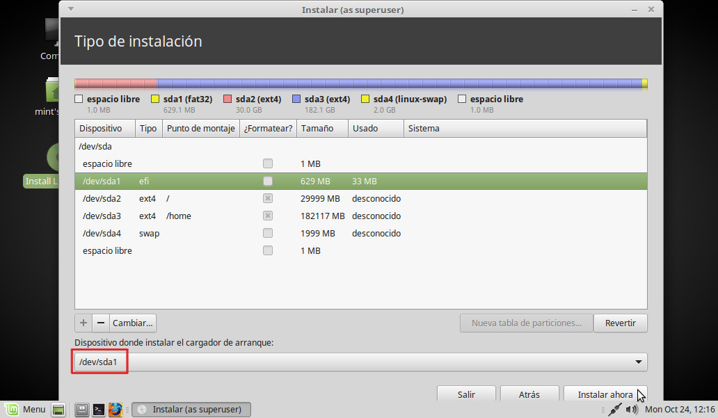 En Dispositivo donde instalar el cargador de arranque elegimos la partición EFI (/dev/sda1).