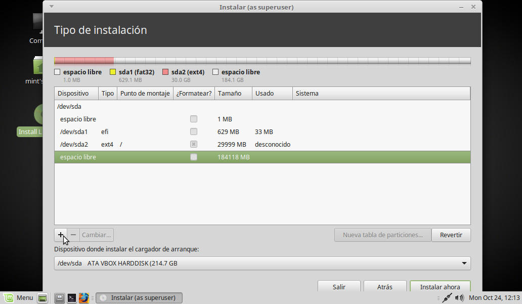 Vamos a indicar donde instalar Linux Mint. Elegimos Más opciones y pulsamos Continuar: