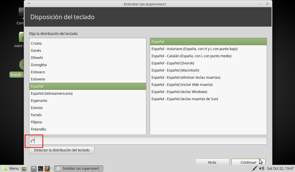 Comprobamos que el teclado está bien configurado escribiendo simbolos específicos de nuestro idioma. Continuar: