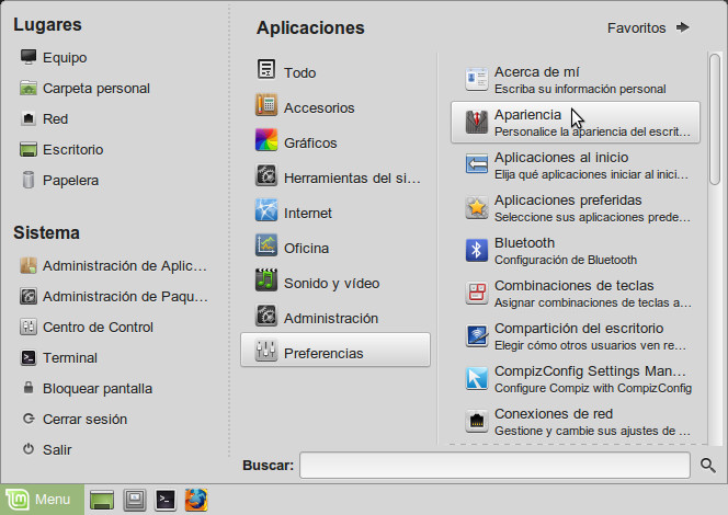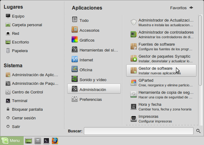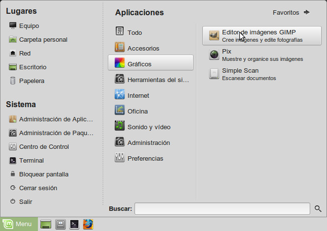 | Tenemos un botón de Menú desde el que acceder a los programas instalados, clasificados por categorías. Se pueden probar sin miedo: cuando algo que vayamos a hacer pueda afectar al sistema, se nos pedirá la contraseña de administrador (root) que habremos introducido al instalar el sistema. Si no estamos seguros de lo que estamos haciendo bastará con cancelar el proceso. |