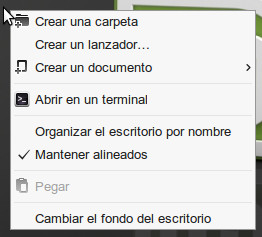 | Hacer botón derecho sobre diferentes partes del escritorio nos ofrece diversas opciones: |