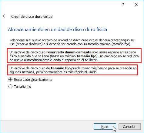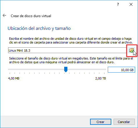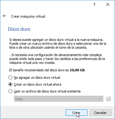 Empezamos a especificar los datos del disco duro de nuestra máquina. Crear: