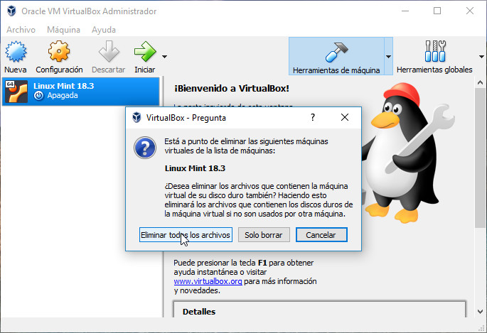 Más adelante, cuando ya no necesitemos la máquina virtual, la seleccionamos y hacemos Máquina > Eliminar: