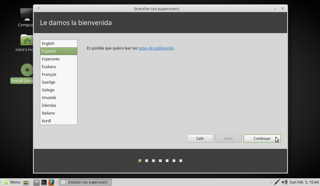 Arracamos el ordenador en Modo Live, como se ha visto ya en esta sección, y en el escritorio pinchamos dos veces sobre el icono Install Linux Mint: