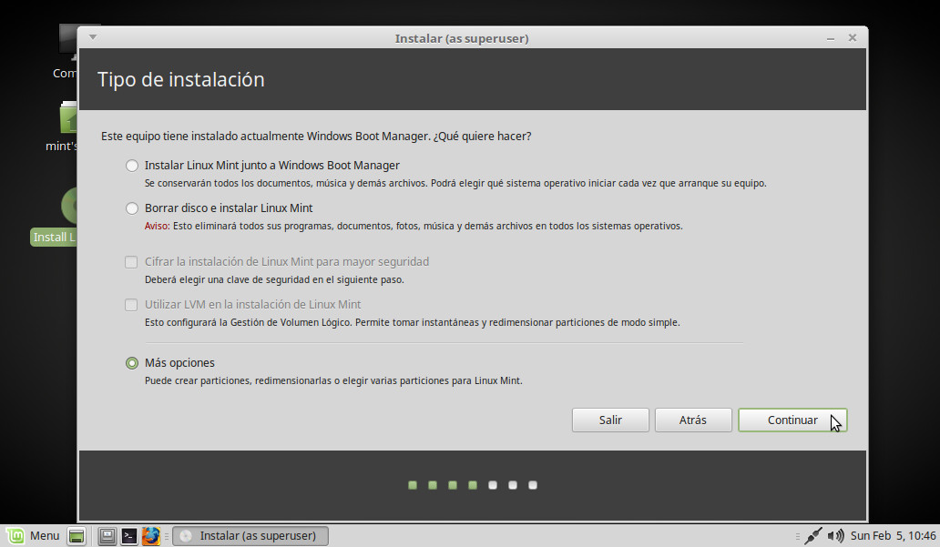 Vamos a indicar dónde instalar Linux Mint. Elegimos Más opciones y pulsamos Continuar: