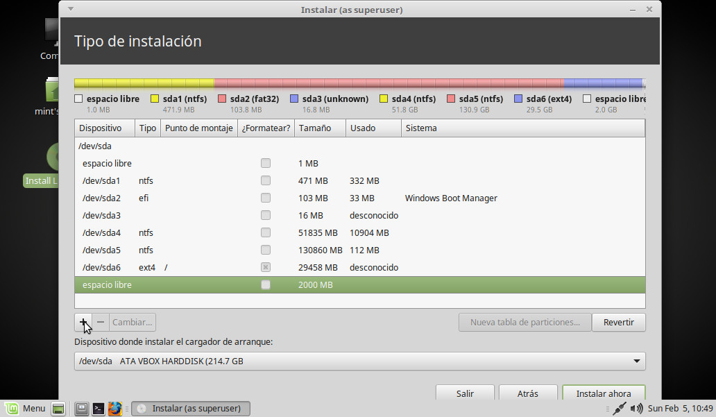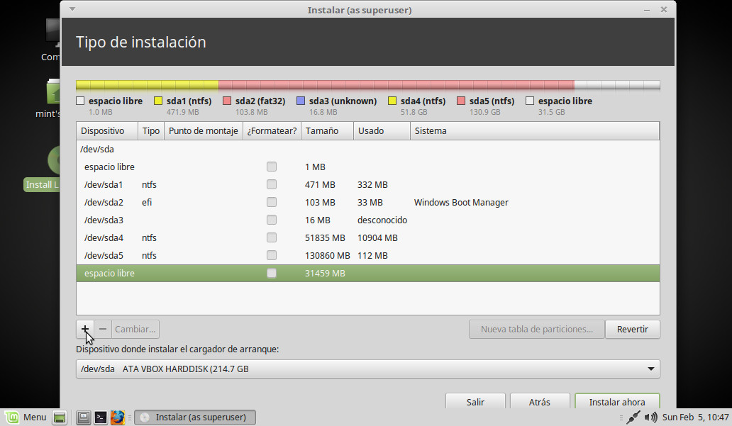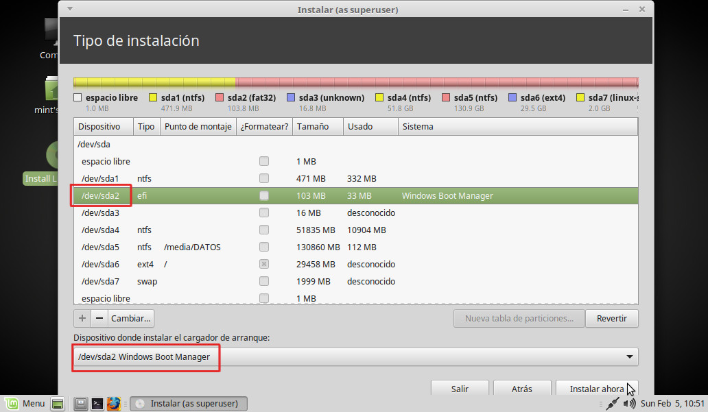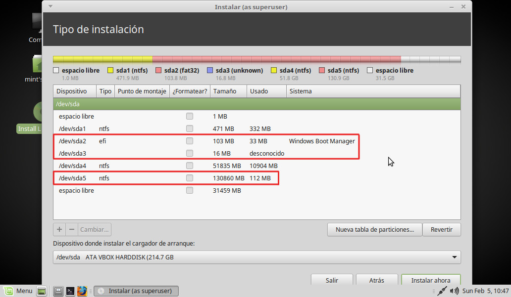 Una vez en la pantalla del particionado, vemos la diferencia con respecto a sistemas anteriores: dos particiones nuevas, entre ellas una denominada efi y otra sin nombre, que no hay que modificar. Nos fijamos también en que la partición que tenemos en Windows para nuestros datos (la más extensa de entre las particiones NTFS) ha sido identificada com /dev/sda5: