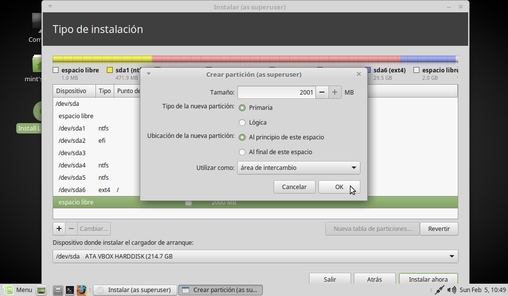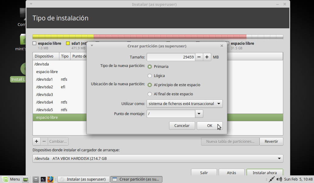 Cambiamos tres parámetros: Tamaño: Reducimos el tamaño en 2000 (en este ejemplo, de 31459 a 29459, aunque si tenemos intención de utilizar la Suspensión deberíamos reducirla en unos 4000 o, incluso, 6000). Utilizar como: Elegimos en el desplegable la opción que indica ext4 (está por defecto). Punto de montaje: Elegimos en el desplegable la primera opción, "/". OK: