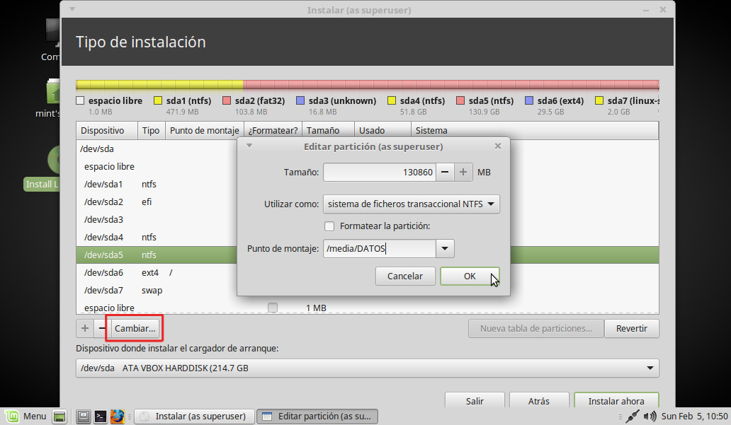Ahora vamos a hacer que la partición de Windows donde tenemos nuestros datos estén a la vista cuando arranquemos el sistema. La marcamos, pinchamos en Cambiar y la dejamos así: