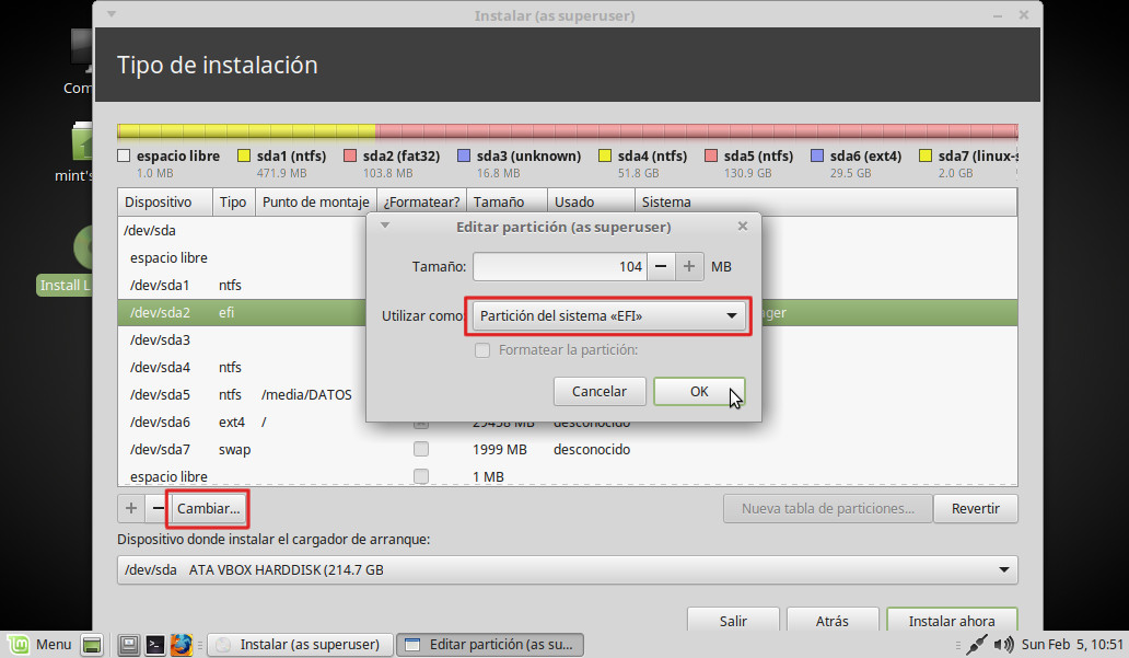 Ahora marcamos la partición efi, pinchamos en Cambiar y comprobamos que la opción Utilizar como: está activada como Partición del sistema «EFI». Si no lo está, utilizamos el desplegable para corregirlo. OK: