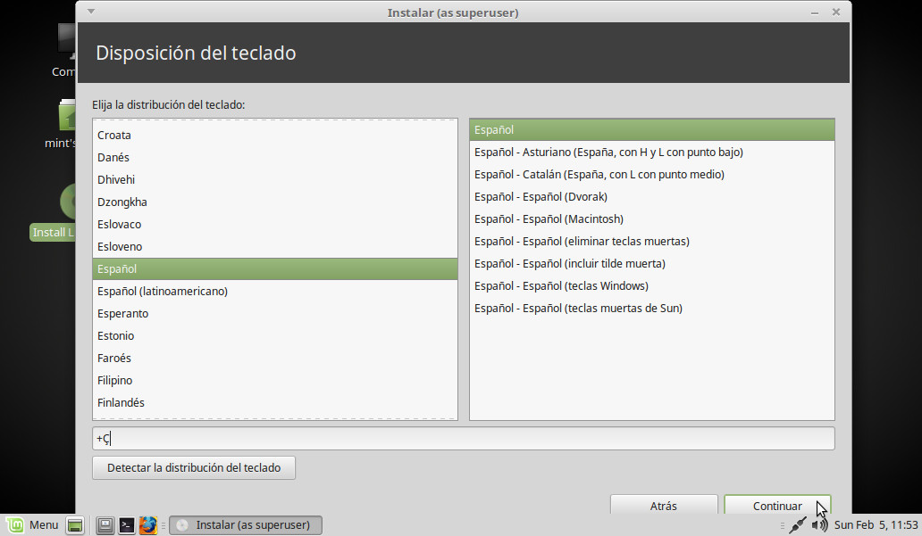 Comprobamos que el teclado está bien configurado escribiendo algunos simbolos en la caja. Continuar:
