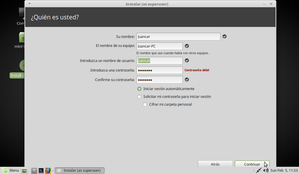 Introducimos nuestro nombre y una contraseña. Esta contraseña será la contraseña de administrador y se nos solicitará cada vez que vayamos a hacer algún cambio en el sistema (importante no olvidarla). Marcamos Iniciar sesión automáticamente y continuamos: