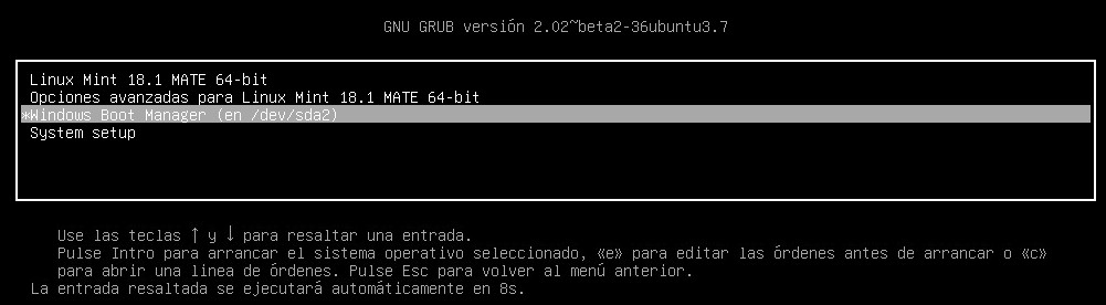 Al reiniciar el ordenador vemos el nuevo menú de Grub. Debemos fijarnos en la primera y tercera lineas. Por defecto el ordenador arrancará ahora en Linux Mint 18.1 y tenemos 10 segundos para, con las flechas del teclado, bajar y hacer [ENTER] sobre la entrada de Windows. Más adelante podremos modificar esto: