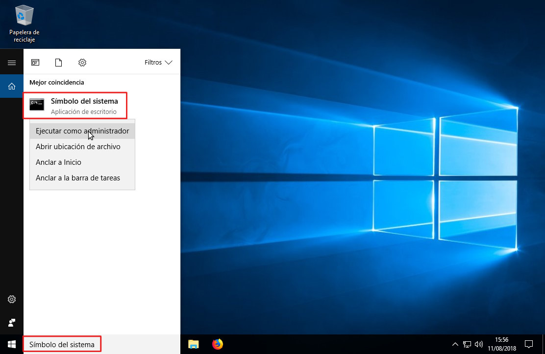 Windows 7 y 10: Buscamos Símbolo del sistema y en el resultado hacemos botón derecho > Ejecutar como administrador.