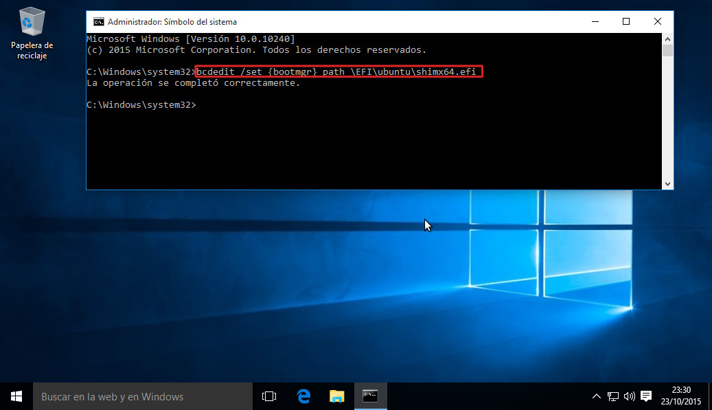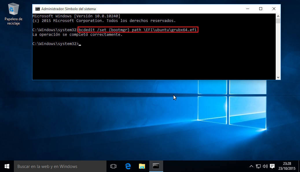 Y en la ventana que se abre escribimos: bcdedit /set {bootmgr} path \EFI\ubuntu\grubx64.efi + [ENTER]