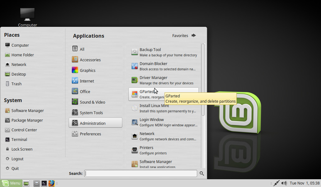 Pinchamos en Administration > GParted: