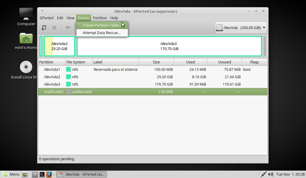 En la ventana que se abre vemos la distribución actual de nuestro disco (podemos ver más o menos particiones). Pinchamos en Device > Create Partition Table: