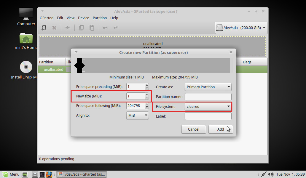 Modificamos dos parámetros: New size (MiB): 1 y File system: cleared. Add: