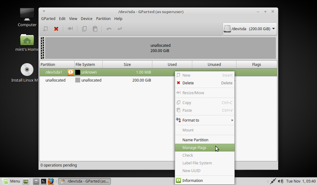 Hacemos sobre la nueva partición (unknown) botón derecho > Manage Flags:
