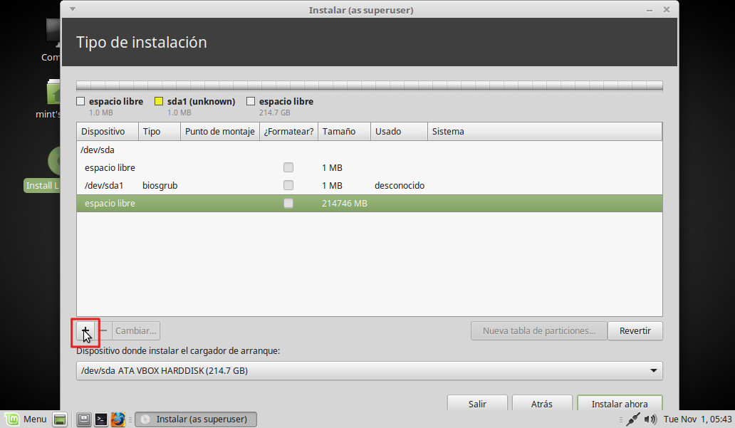 Vemos de nuevo nuestro disco (sda) con la partición que hemos creado antes (/dev/sda1). Marcamos el espacio libre inferior y pinchamos en "+":