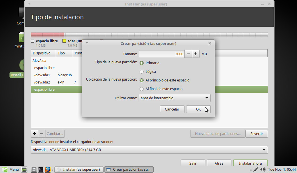 Vamos a crear una partición que servirá como apoyo a la memoria RAM instalada en el equipo. Tamaño: Para nuestro ejemplo, 2000. Utilizar como: Elegimos la opción que indica area de intercambio y OK: