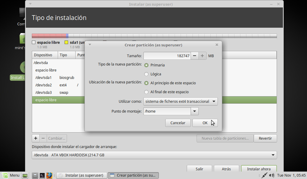 Tamaño: Todo lo que nos quede libre. Utilizar como: Elegimos en el desplegable la opción que indica ext4. Punto de montaje: Elegimos la opción /home (equivalente a Mis documentos) y OK: