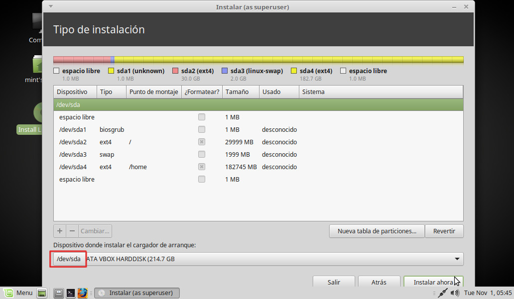 Todo está preparado. Comprobamos que al final del disco queda una partición de 1 Mb. que es donde irá la información referente a la tabla de particiones GPT y comprobamos también que el cargador de arranque va a instalarse en /dev/sda (no en /dev/sda1). Pinchamos en Instalar ahora: