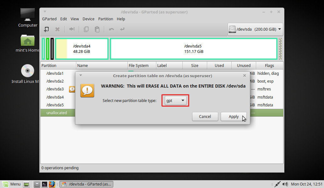 En el desplegable elegimos gpt y pinchamos en Apply: