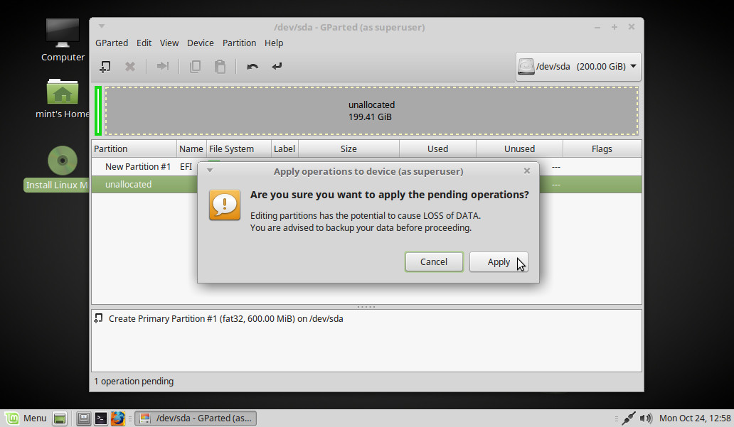 Lo dejamos como en la imagen: New Size (MiB): 600. Partition name: EFI. File system: fat32. Label: El que queramos. Add: