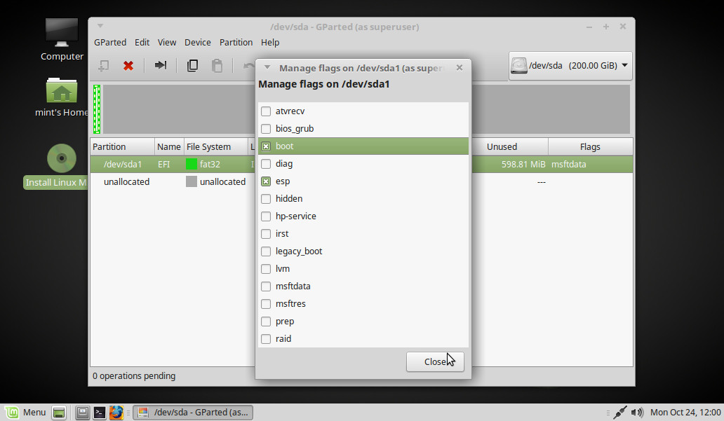Marcamos la opción boot (se marca automáticamente también esp). Close y cerramos también GParted: