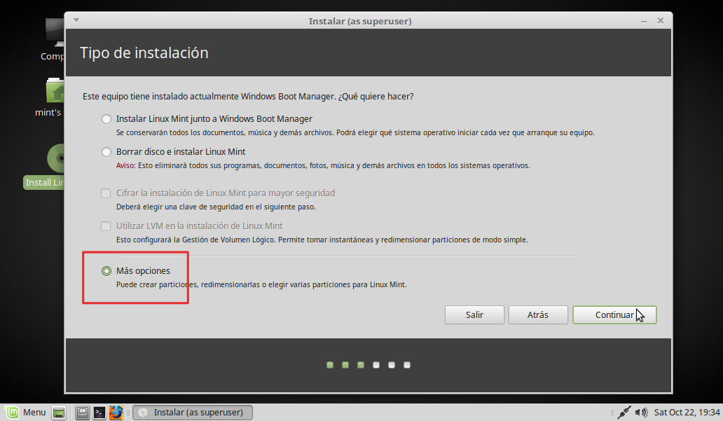 Vamos a indicar donde instalar Linux Mint. Elegimos Más opciones y pulsamos Continuar: