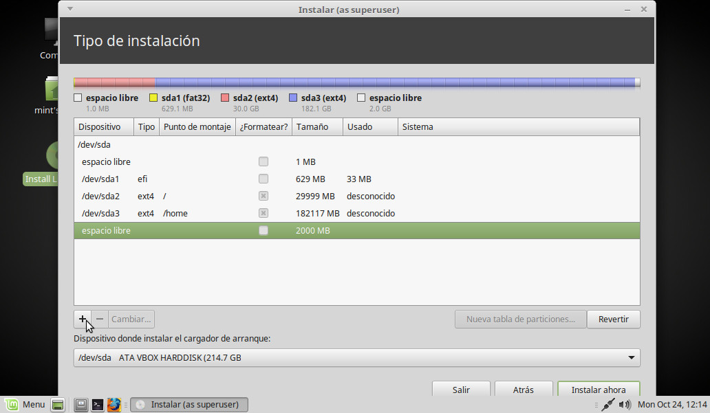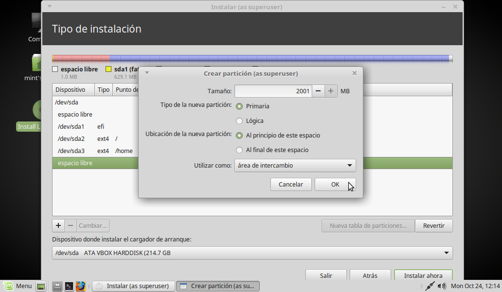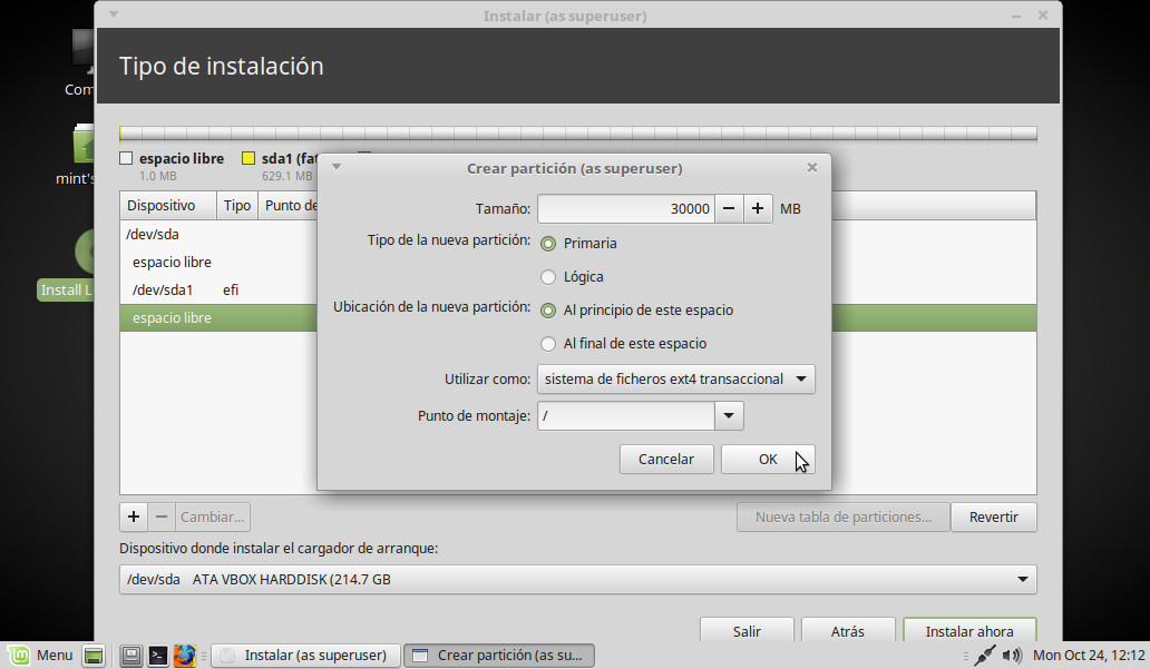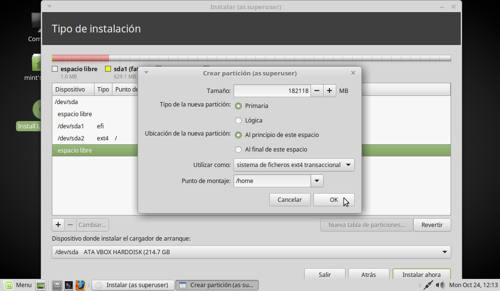 Punto de montaje: Elegimos en el desplegable la opción, /home (será nuestra Carpeta personal). OK: