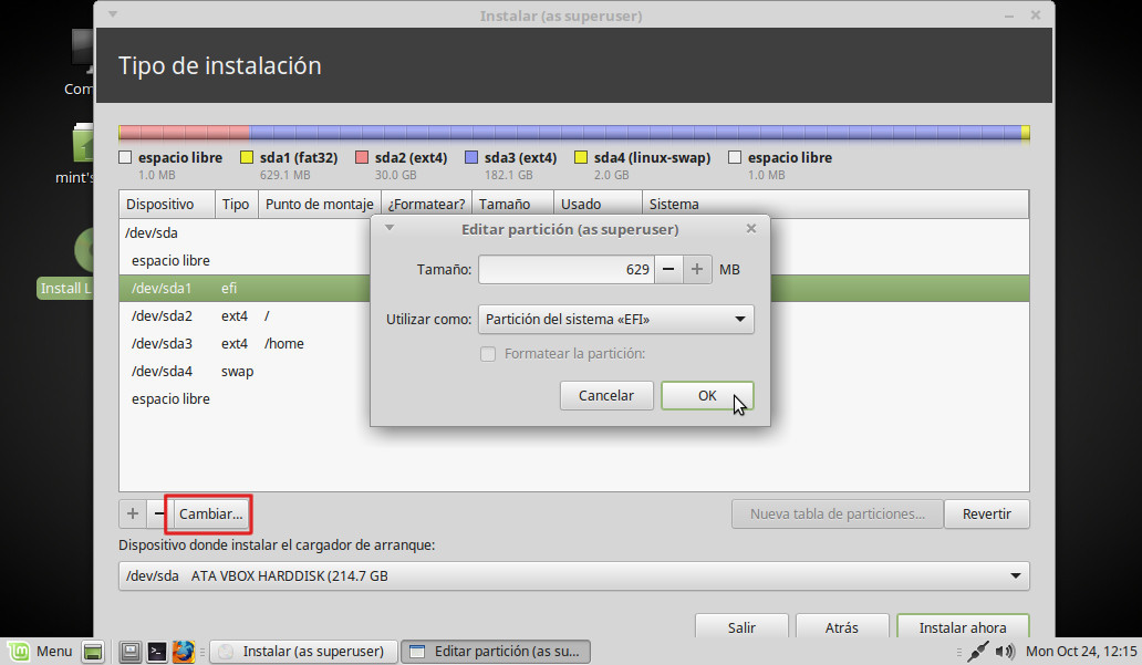 Marcamos la partición efi, pinchamos en Cambiar y comprobamos que la opción