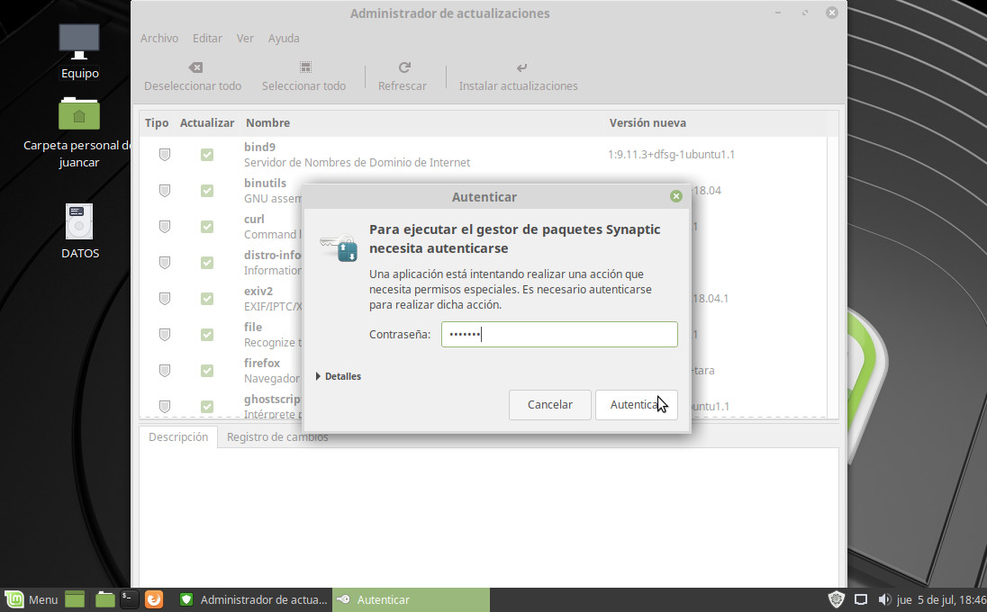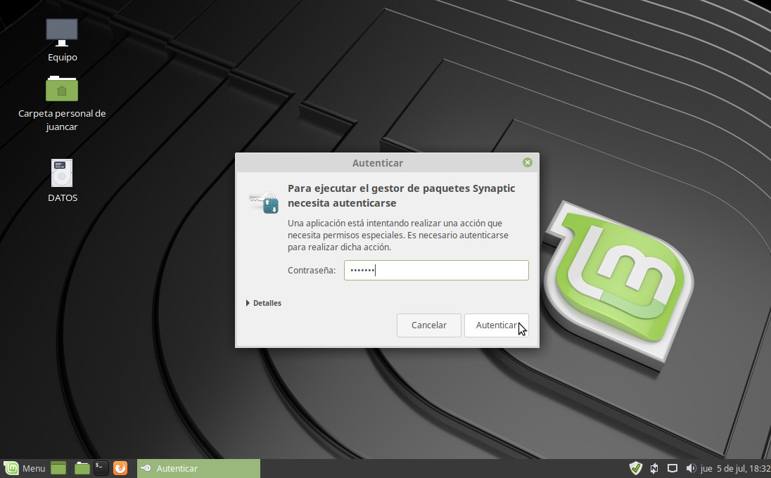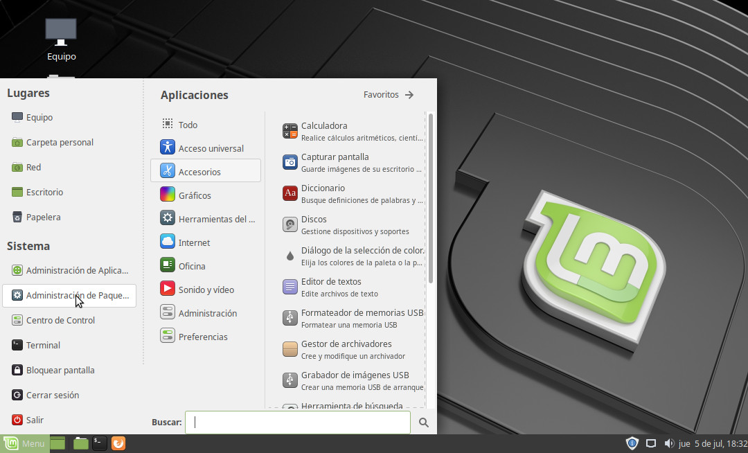 Hacemos Menú > Administración de paquetes (se nos solicitará la contraseña de administrador):