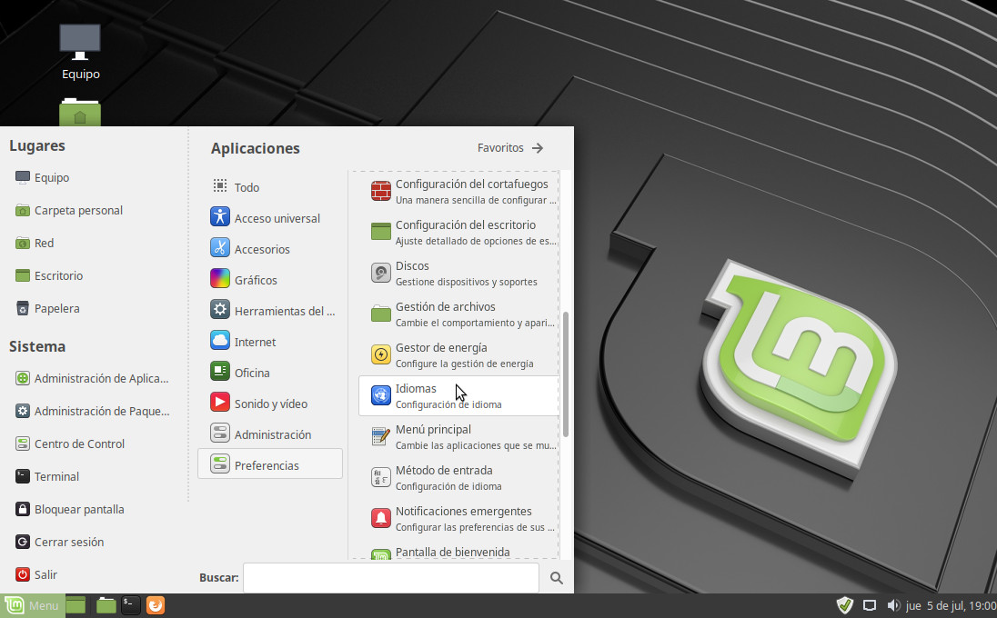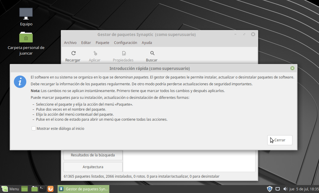 Linux Mint (versión 19). Cerramos la ventana de bienvenida desmarcando o no la opción de que se muestre al inicio: