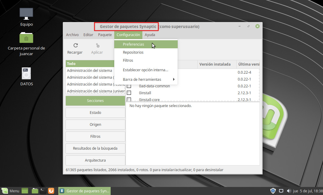 En la ventana principal del Gestor de paquetes Synaptic pinchamos en Configuración > Preferencias: