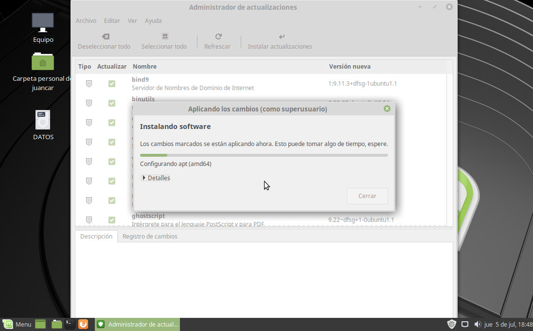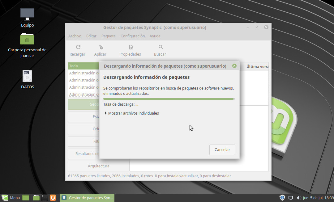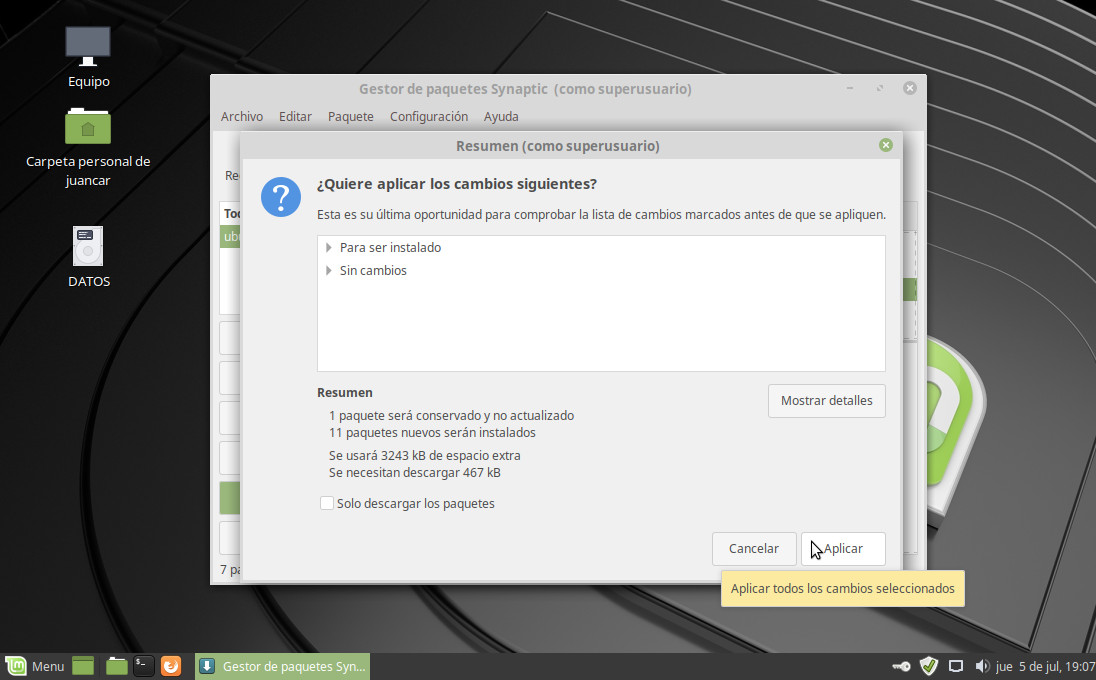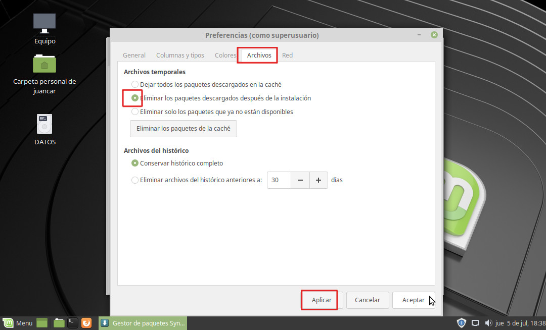 Y en la pestaña Archivos marcamos la opción Eliminar los paquetes descargados después de la instalación > Aplicar > Aceptar (así liberamos el espacio que ocupan esos paquetes en el disco y ganamos espacio):