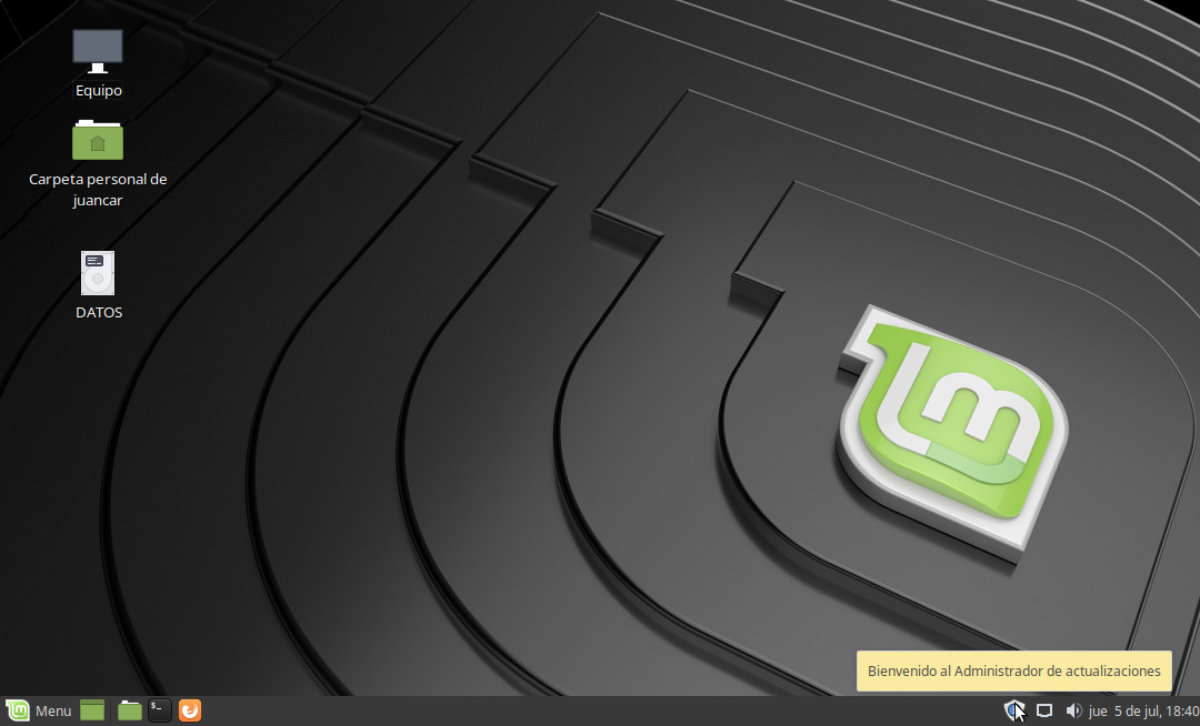2.- En cualquiera de las versiones de Linux Mint se nos ofrecerán regularmente actualizaciones tanto del sistema como de los programas y sabremos cual es nuestra situación al respecto por un icono con forma de escudo que aparece en la parte inferior derecha de la pantalla y que tiene dos estados: Pendiente de actualizar o Sistema actualizado. Vemos el proceso de actualización: