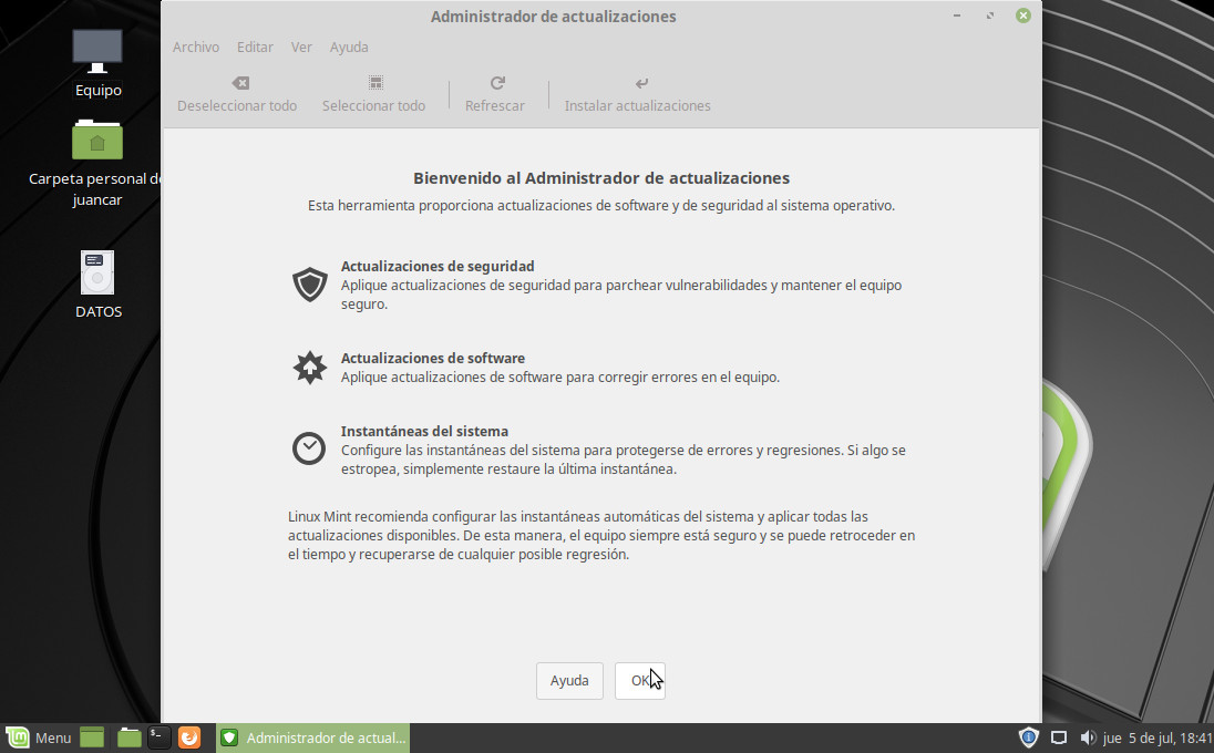 El Administrador de actualizaciones está en constante evolución. En esta versión se nos ofrece configurar copias de seguridad del sistema, algo recomendable en el caso de que tengamos algún problema en el futuro. Pinchando en OK arranca directamente la aplicación Timeshift que se encarga de ello (+info):