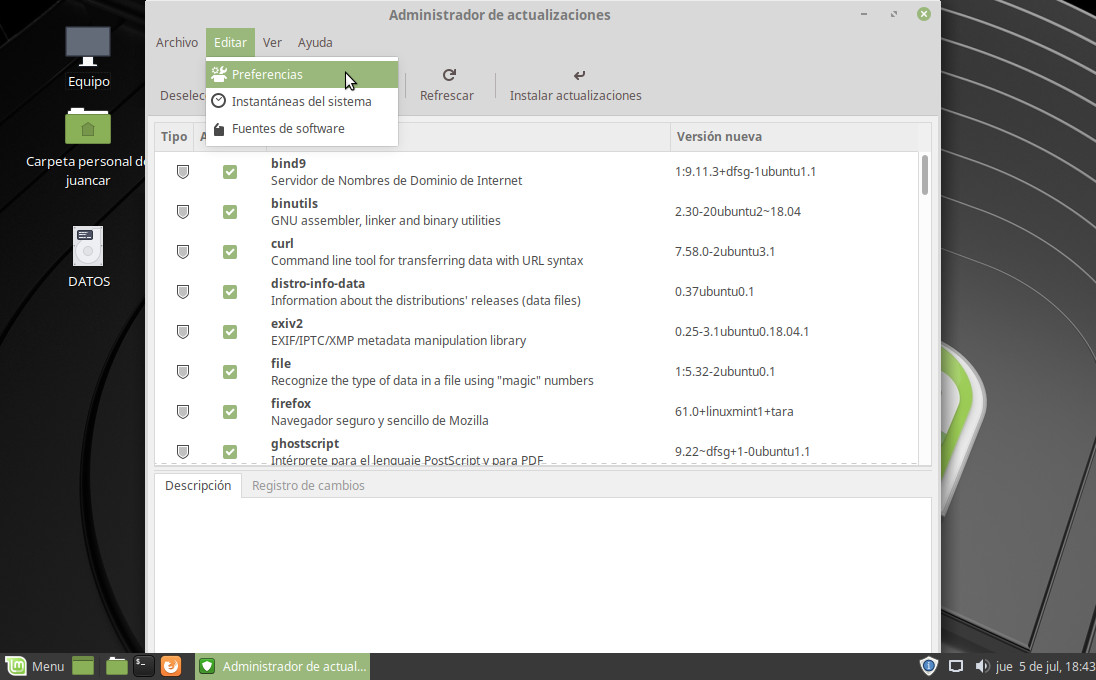 Seguidamente, configuramos un poco el Administrador de actualizaciones. Editar > Preferencias: