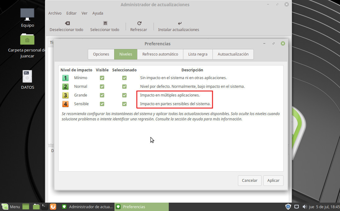 Configuración por defecto de la pestaña Niveles en Linux Mint 19. (Esta opción no está disponible en LM 19.2) Como vemos, las actualizaciones de nivel 3 y 4 (activadas por defecto) tienen cierto riesgo (y, por eso, se recomienda tener configuradas las instantáneas del sistema):