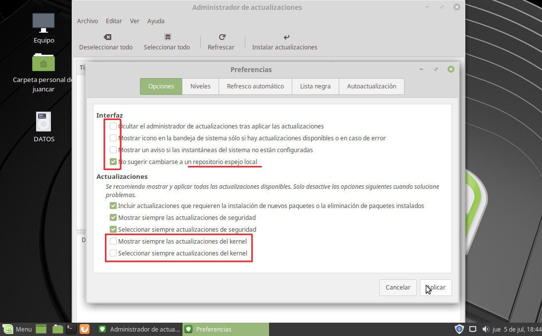 En la pestaña Opciones, elegimos el comportamiento del programa. Aplicar: Para conectar el sistema al mejor repositorio espejo local seguimos estas instrucciones. Sobre el modo de actualizar el kernel tenemos más información en este tutorial.