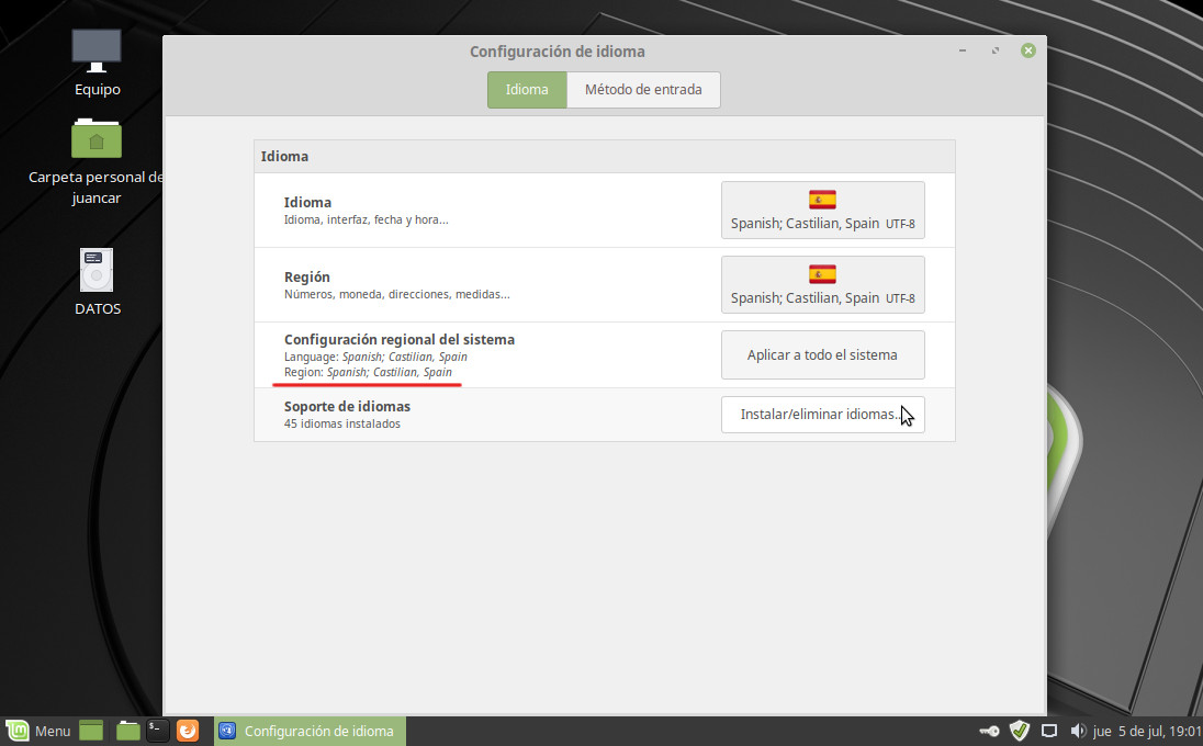 Hecho. Pinchamos en Instalar/eliminar idiomas: