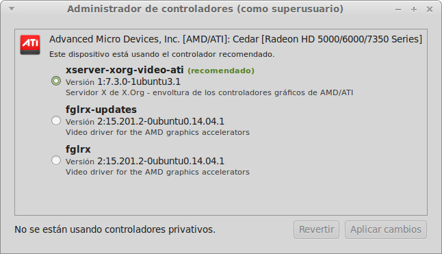 Aquí, se está utilizando el controlador libre incluído en el kernel para una gráfica ATI pero tenemos disponibles dos controladores privativos: